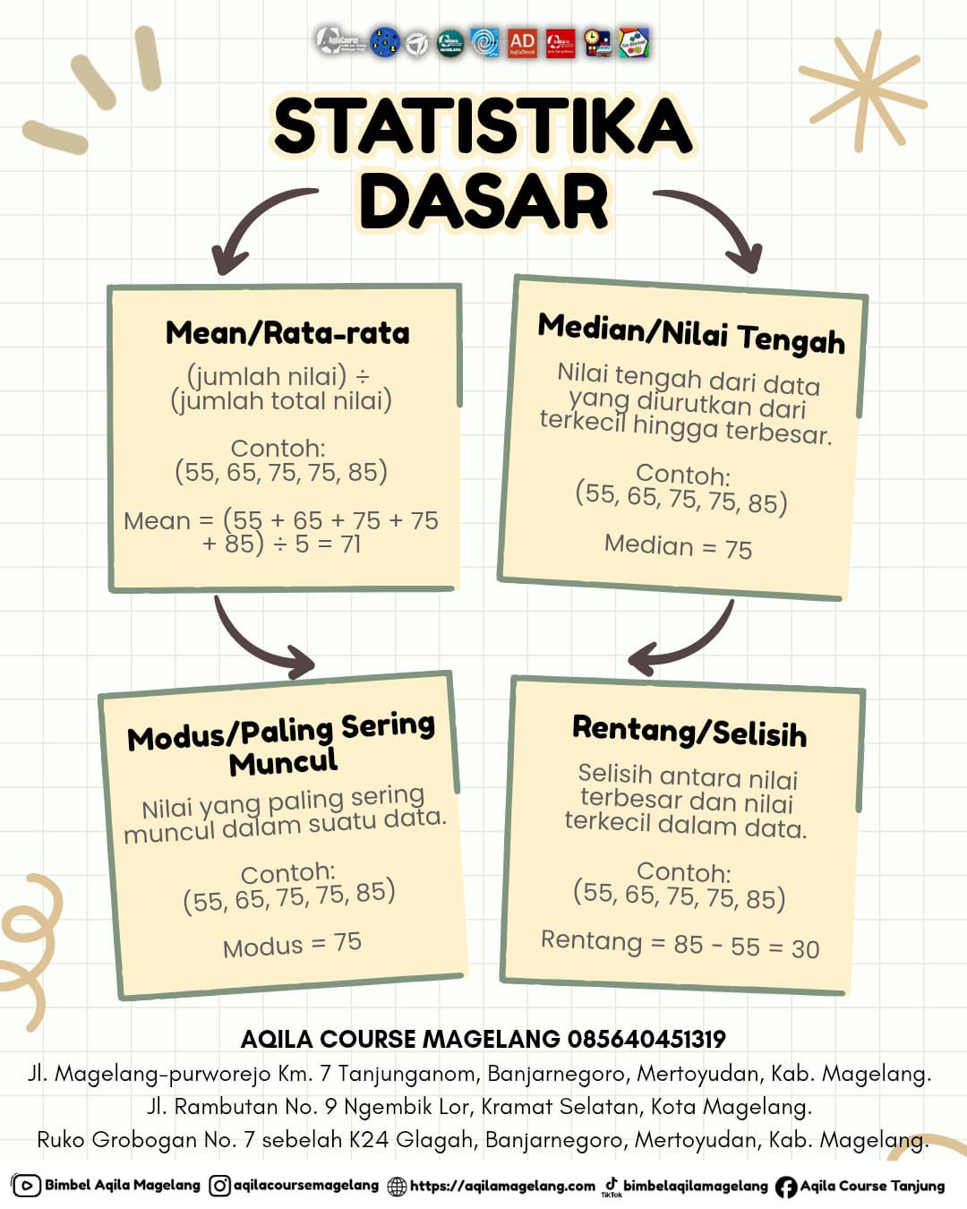 Mean = 71 | Median = 75 | Modus = 75 | Rentang = 30